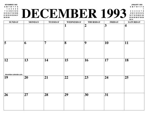 Calendar December 1993 Printable Old Calendars